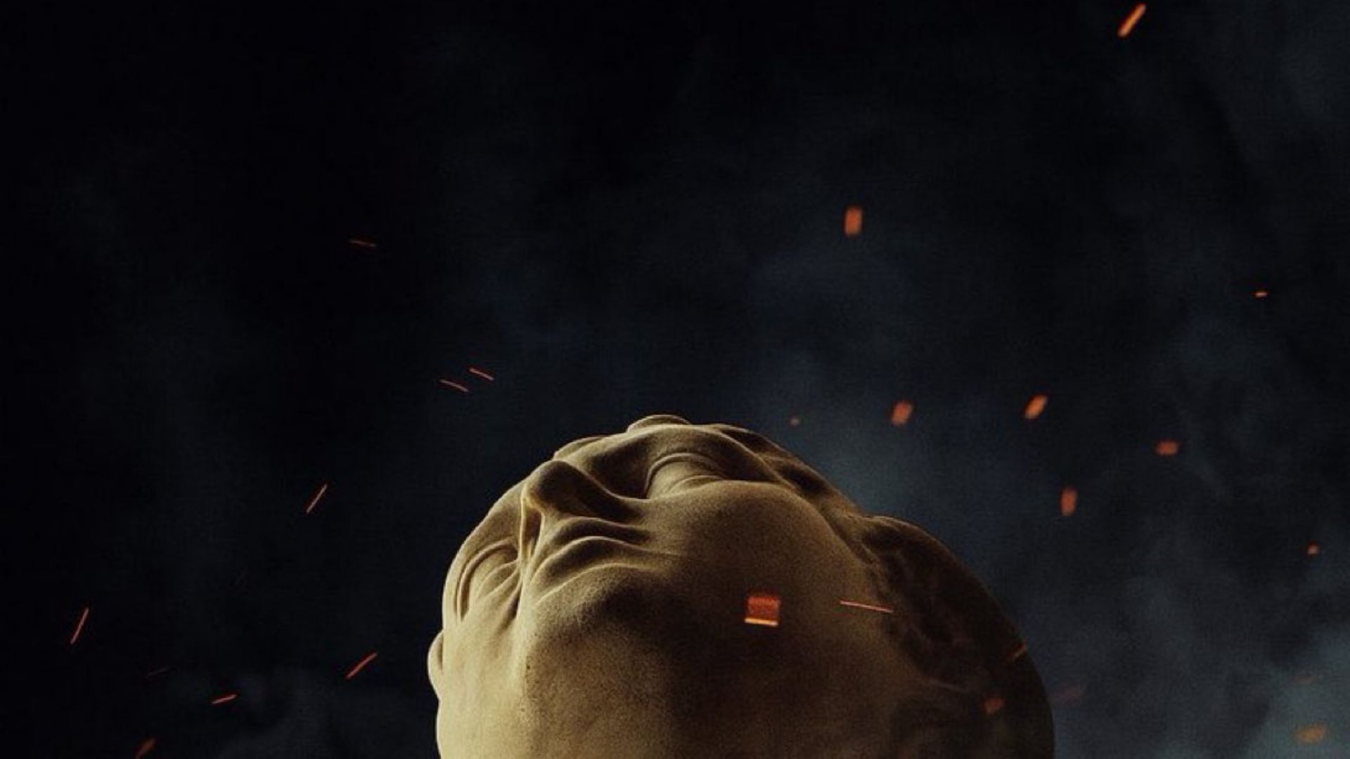 O cartaz mostra a cabeça de uma estátua grega decapitada, rolando no chão em meio a poeira e brasas.