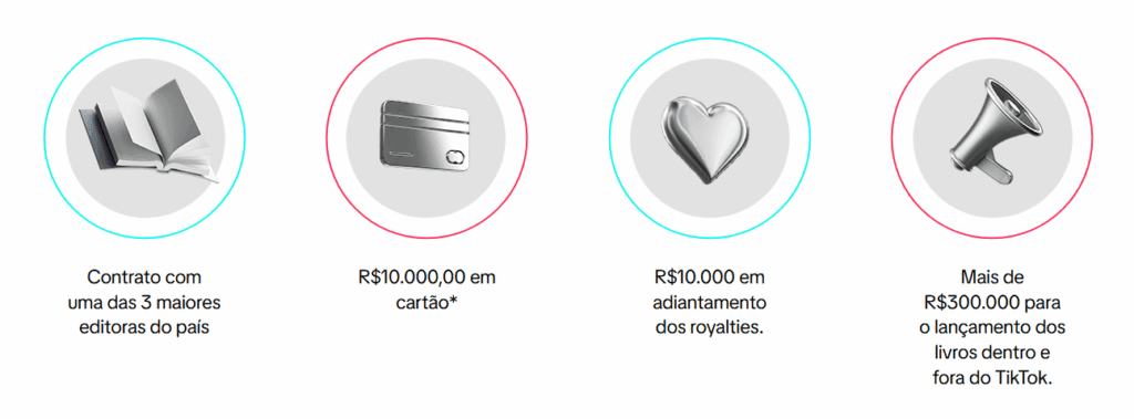 Ou seja, serão três vencedores, um por categoria. Além do contrato com uma dessas empresas, os ganhadores ainda terão prêmio em dinheiro no valor de R$ 10.000 cada, adiantamento em 10 mil reais nos royalties de vendas e um incentivo de mais de R$300.000 para o lançamento dos livros dentro e fora do TikTok.