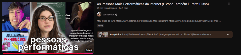 No vídeo de Júlia Leivas, “As Pessoas Mais Performáticas da Internet (E Você Também É Parte Disso)”, ela reage em alguns vídeos do TikTok sobre o assunto. Alguns deles são de pessoas que vão ao cinema com um kindle ou um livro nas mãos, provavelmente para destacar que leu o volume daquela obra adaptada ou para demonstrar aos outros assistintes que é um superfã da adaptação. Eu acho que levar livros para o cinema é uma atitude sem sentido, mas claramente é feito para chamar a atenção daqueles a sua volta e hoje, com as redes sociais, tais atitudes são realizadas para viralizar.