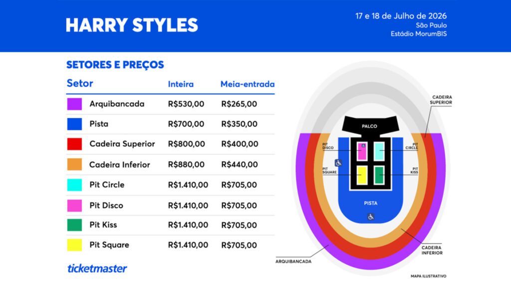 A venda oficial acontece pela Ticketmaster Brasil, responsável exclusiva pela comercialização dos ingressos.