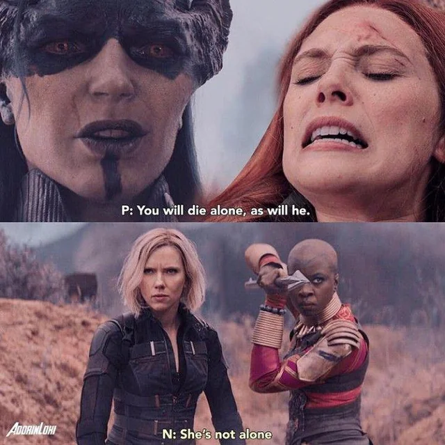 Em Vingadores: Guerra Infinita, outra cena já havia destacado a união entre as heroínas do universo Marvel. Durante a batalha em Wakanda, Natasha Romanoff, a Feiticeira Escarlate luta contra Próxima Meia-Noite, mas acaba em desvantagem. Viúva Negra e Okoye então surgem na cena para ajudar Wanda contra a vilã. Nesta cena, Próxima Meia-Noite afirma que Wanda morrerá sozinha, então Natasha Romanoff fala a frase que logo virou símbolo da união das heroínas: